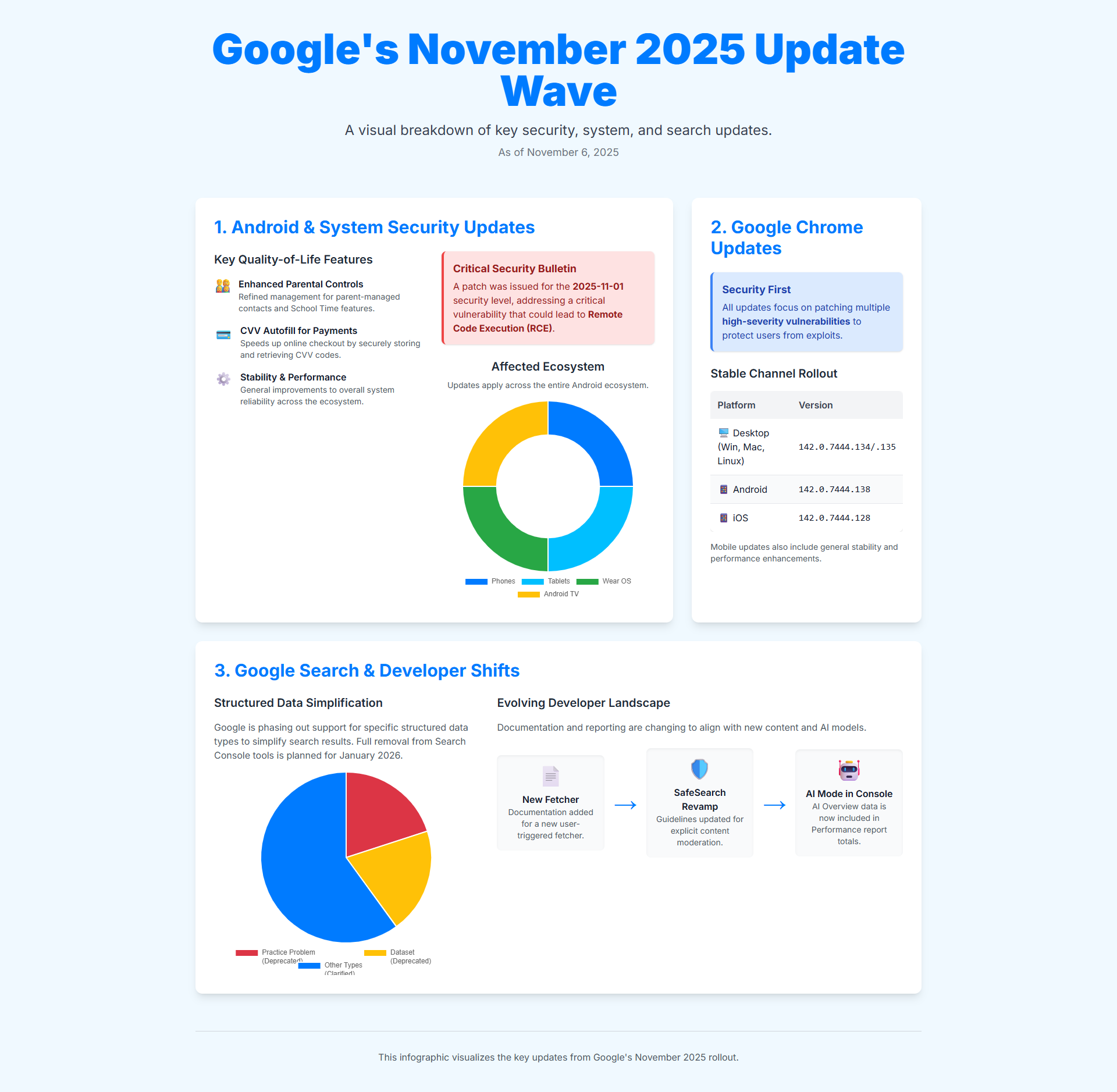 Google has initiated its traditional November update cycle, delivering essential security patches and feature rollouts across the Android ecosystem, Chrome browser, and Google Search. The updates, released around November 6, 2025, focus heavily on tightening security, enhancing quality-of-life features for users, and simplifying the backend documentation for web developers....